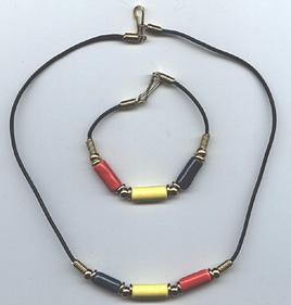Two piece set. Enamel-glazed ceramic beads and nickel findings strung on Mykonos Leather.